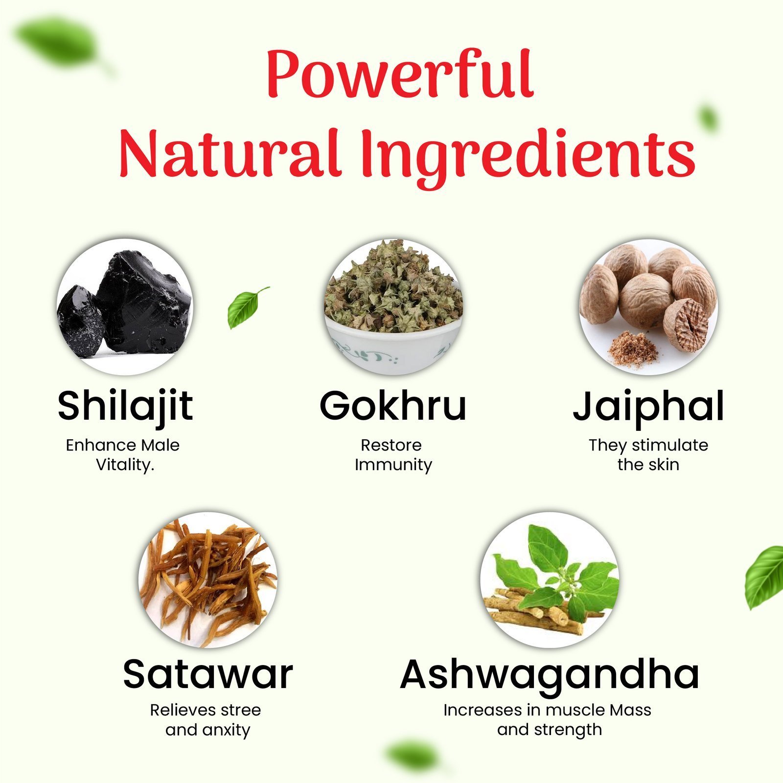 Withania somnifera, Mucuna pruriens, Asparagus racemous, Zingiber officinale